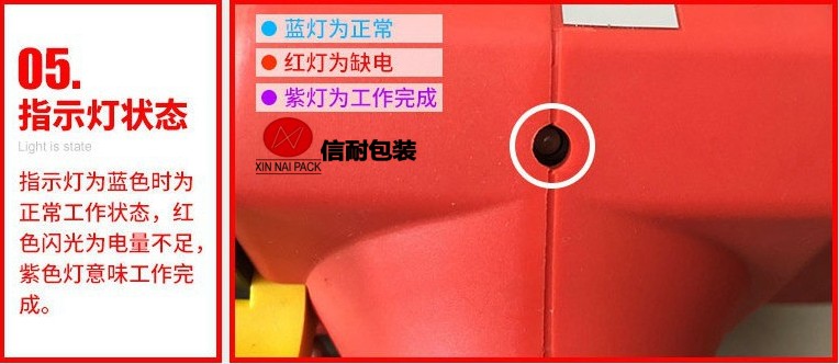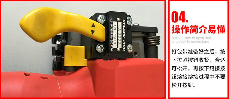 操作方法: 將塑鋼帶或塑料打包帶,從上往下纏繞捆包物體一圈后,將打包帶接頭處放入機器工作槽內(nèi),由電機帶動束緊輪,將打包帶束緊,通過摩擦作扣的方式將帶粘接,最后自動進行切帶。